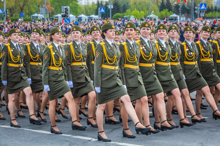 Military women marching at the celebration of the 75th anniversary of the victory in the Great Patriotic War, parade of May 9 in Minsk, Belarus. Minsk, Belarus - May 9 2020.