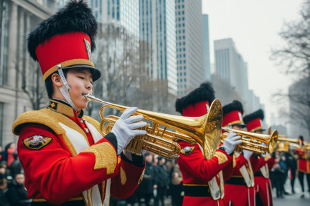 Musicians dressed in vibrant red uniforms playing trumpets while marching in a lively parade through the streets of New York City