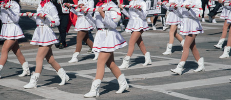 Panorama view young parade performers march in formation wearing white cowboy boots, brown knee-high socks, flared skirts with red trim. Attire adds texture and rhythm festive street choreography. USA