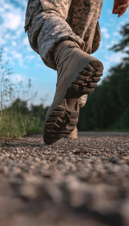Close Up Shot of Determined Soldier Marching Solemnly on Quiet Desert Road, Showcasing Resilience
