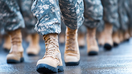 Army soldiers in uniform stand in formation on a concrete surface with yellow crosswalk lines. They wear combat fatigues and boots, showing discipline and readiness.
