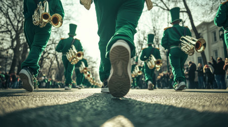 Marching Band in Saint Patrick's Day Parade with Participants in Green Costumes. Concept of Irish Celebration, Festive Parade, Cultural Tradition.
