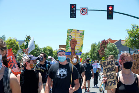 Alameda, CA - July 4, 2020: People protesting the death of George Floyd and others. Black Lives Matter protest organized by ProtestBayArea and Alameda.blm.protest youth groups.