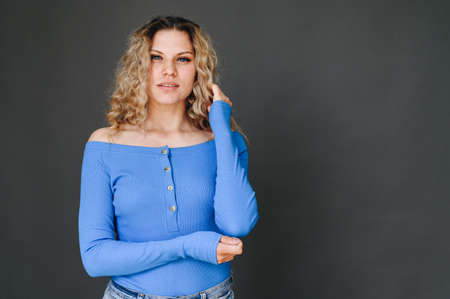Beautiful young curly girl on a gray background.