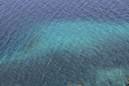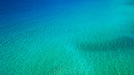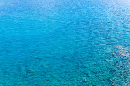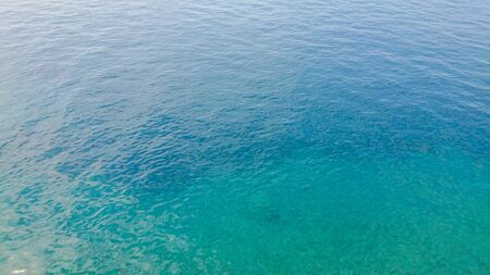 Sea surface aerial view. Background image of the turquoise sea. Deep sea and corals. Aerial drone shot of turquoise water, space for text. Aquamarine background. Sea Aerial view.