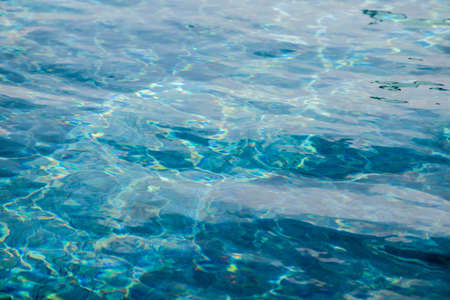 Turquoise sea close-up in bright sunlight.Colorful tropical background. The concept of summer, vacation, travel.The purest clear blue water, small waves roll on the sandy shore. The texture of the sea