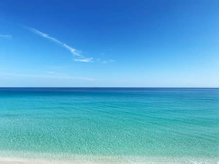 turquoise blue sea horizon with two thirds of blue sky with white clouds, background with copy space