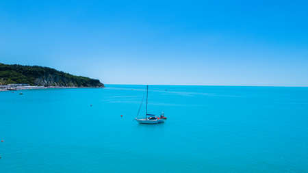 Beautiful colored sea. On the horizon are visible sailboat and motorboat. Polis, Cyprus.