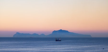 Dramatic spring sunset on the beach Torre Conca. View of Celalu cape Mediterranean sea, Sicily, Italy, Europe.