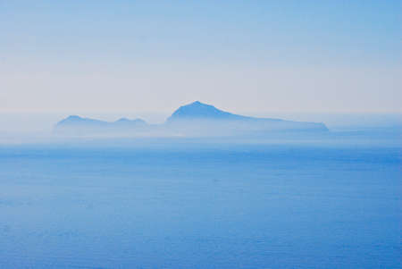 The Capri Island view from the Napoli Gulf in the lightblue mornings fog in south Italy
