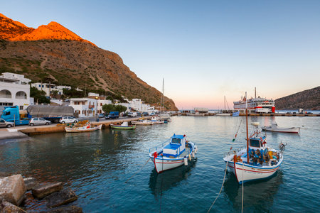 Fishing boats and a ferry in port of Kamares on Sifnos island, Greece.