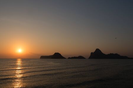 Aerial view of the island of Vedra during sunset. Ibiza Spain