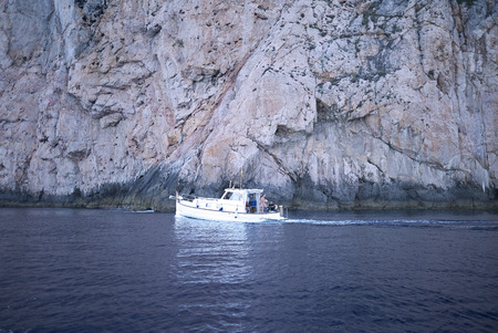 Ibiza, Balearic Islands, Spain - August 31, 2015: Boat near the cliffs