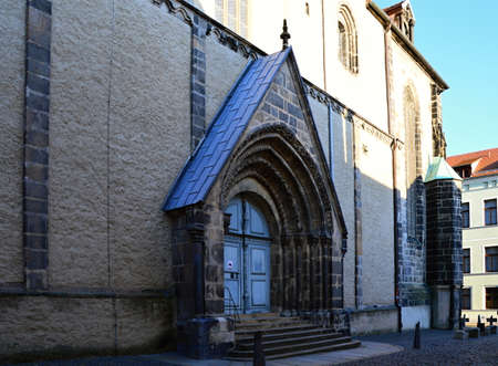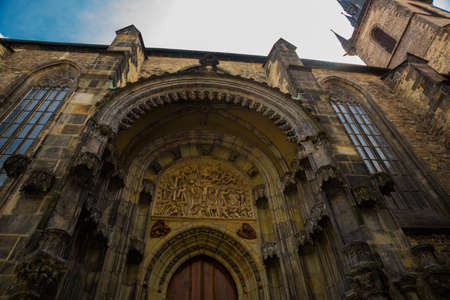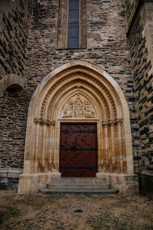 Gothic portal of medieval stone St. Bartholomew? S Church, architectural element of facade, decorative bas-relief details, Gothic Cathedral in Kolin, Central Bohemia, Czech republic, November 28, 2020