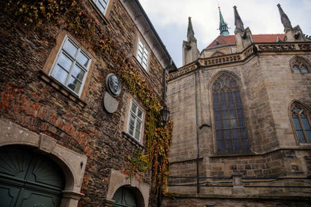 Regional Museum with ivy-covered wall, Dvorak? S Museum of Prehistory or formerly parish school near Gothic Cathedral, Medieval stone St. Bartholomew? S Church, Kolin, Czech republic, November 28, 2020