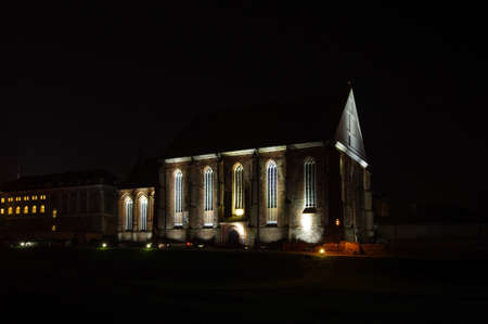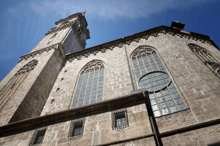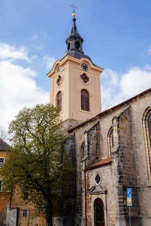 Medieval gothic church of St. Ignatius of Loyola with baroque tower in sunny day, Historical center, gothic arched windows, Bohemian Paradise or Cesky Raj, Jicin, Czech Republic, May 01, 2021