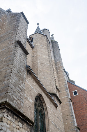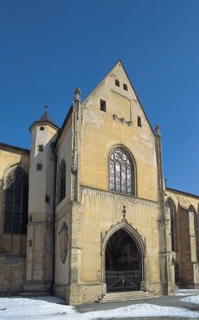 Kutna Hora, Central Bohemian, Czech Republic, 5 March 2022: Gothic stone Church of St. James or Kostel sv. Jakuba with bell and clock tower, medieval architecture at old town, lancet windows