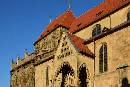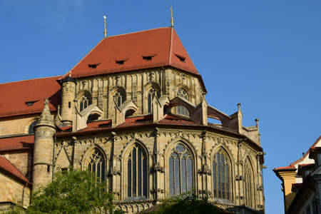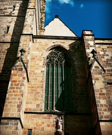 Kolin, Central Bohemia, Czech republic, 10 July 2021: Medieval stone St. Bartholomew? S Church with tower in sunny summer day, arched windows, chimeras and gargoyles, Gothic Cathedral with belfry.