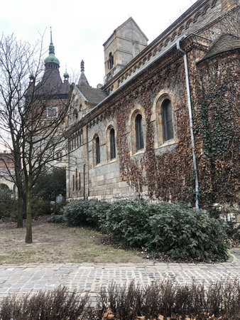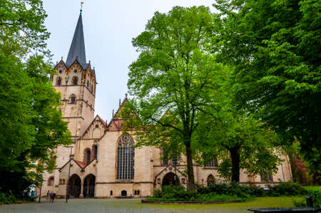 Backside facade of Paulskirche church with pointy towers in Schwerin near Hamburg