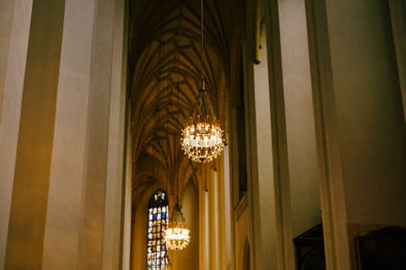 The interior of an old Catholic church, huge chandeliers suspended from the ceiling.