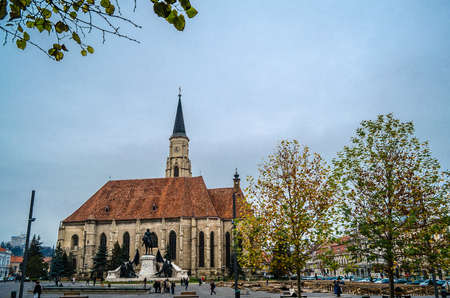 Reformed Church in Cluj-Napoca, Transylvania, Romania. Built in gothic style with renaissance elements and the statue of Saint George in front. Protestant, orientation moderate Calvinist, origin 1564.