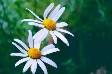 Delicate fragrant beautiful chamomile flowers with white petals bloom among dark grasses and evening summer twilight. Nature in summer.
