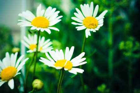 Chamomile flower leucanthemum in the garden, selective focus, blurred bokeh background, in retro style of film photography, bottom view