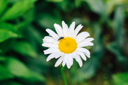 White camomile flower on the close-up and green background, summer view