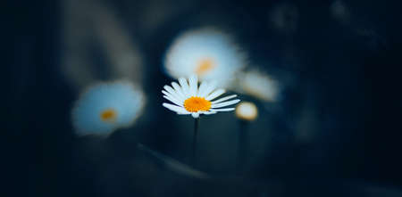 Daisy flower in soft blue light. Macro. Spring and summer daisies in the meadow. Blurred bokeh background in soft blue light as space for text. Design and flower.