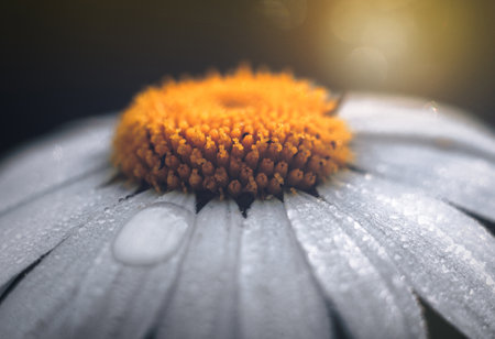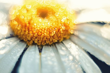white Daisy with yellow stamens close up covered with drops of dew in the summer