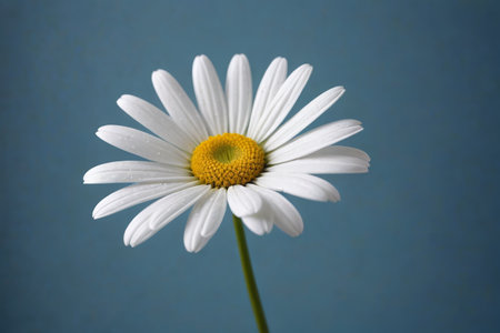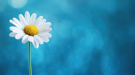 A stunning closeup of a white daisy flower with a vibrant yellow center set against a soft blue background, evoking feelings of tranquility and beauty.