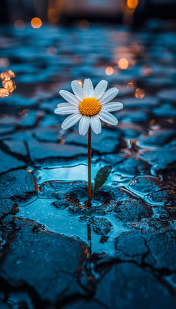 A delicate white daisy emerges amidst parched earth, bathed in a cool blue glow from the sunset sky, symbolizing resilience and hope in adversity.