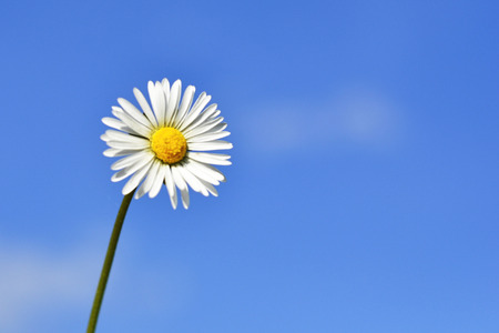Daisy against a clear blue sky Its white petals circle a bright yellow center Simple and uplifting.