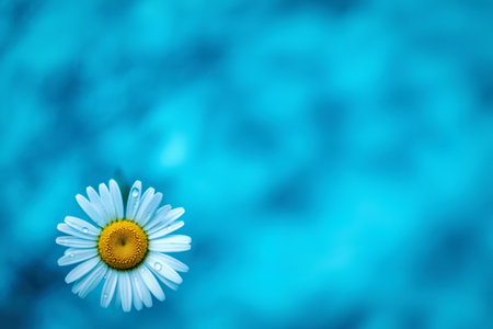 A close-up, macro shot of a white daisy with a yellow center, adorned with clear water droplets. The flower is set against a soft, blurred, vibrant blue backdrop.