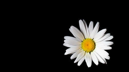 Single chamomile blossom stands out against a black background, showing its white petals and yellow center.