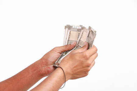 Indian man counting newly launched indian five hundred rupees. Money counting background business concept on white background