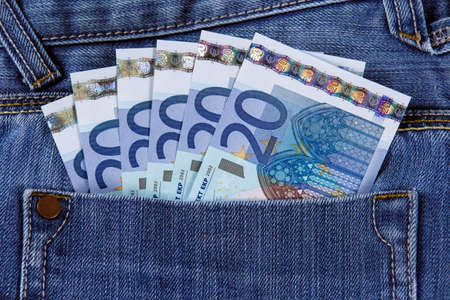Twenty Euro Bank Banknote in the pocket of jeans. European Union.