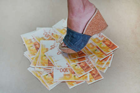 Women's shoes on stack of new Israeli money bills (banknotes) of 100 shekel
