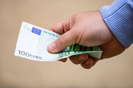 Man holds money in his hands. Cash in euro for payment or exchange. Male counts salary in euro banknotes. Saving money, withdrawal banking deposit. European money. Financial crisis