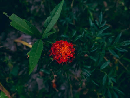 Beautiful marigolds grow among greenery. Small velvet red and yellow flowers in flowerbed close up. Background of tagetes in ground with copy space.