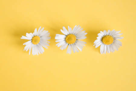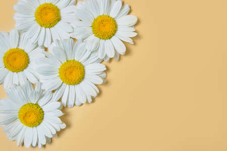Composition chamomiles flowers on color paper background. Copy space template for postcard, lettering, text or your design. Flat lay Top view Concept Hello summer.