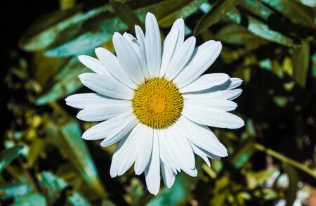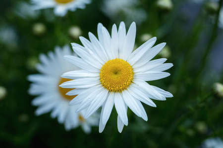 Delicate, bright chamomile flowers in a meadow under the sun. Selective focus.