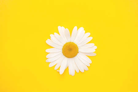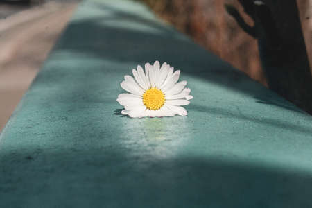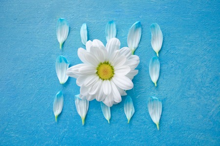 Chamomile flower and petals isolated on turquoise surface. Guess on daisy. Poster design element.