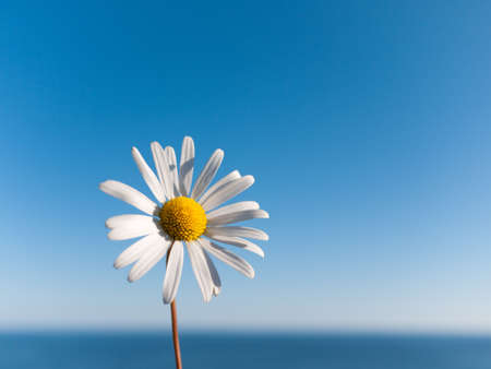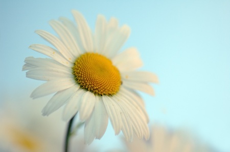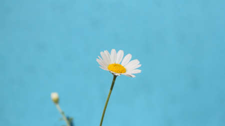 Daisy flower in soft blue light. Macro. Spring and summer daisies in the meadow. Blurred bokeh background in soft blue light as space for text. Design and flower.