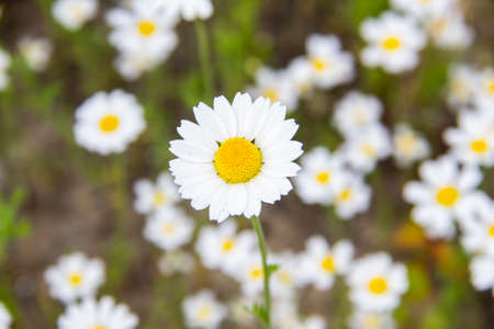Wild camomile flowers on the field on a sunny day. shallow depth of field