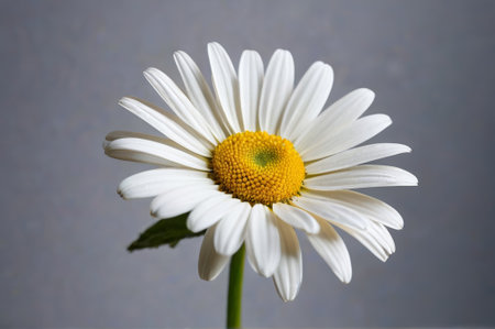 A single daisy with dew drops on its petals, captured in natural light, showcasing the intricate details and freshness of the flower.