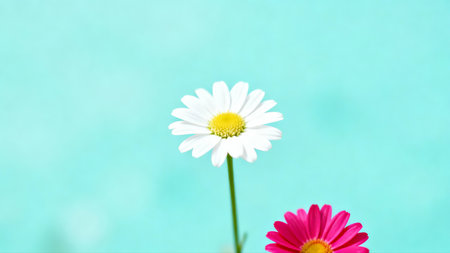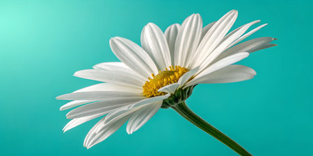 Stunning white daisy with vibrant yellow center against a calming turquoise backdrop