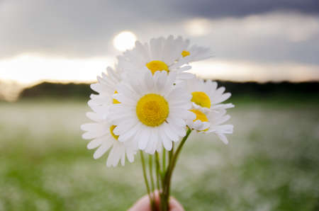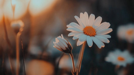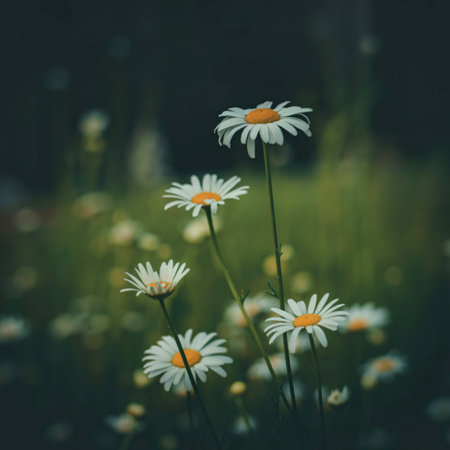 Tranquil scene of white daisies with a moody, vintage filter in a meadow at twilight
