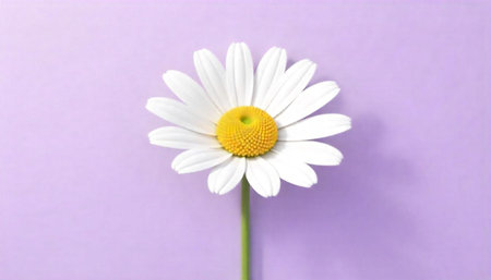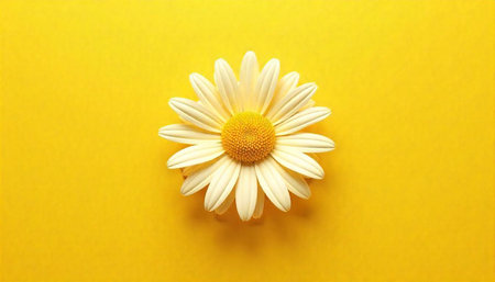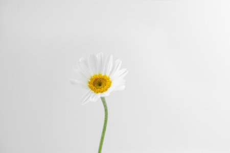 A single white daisy with a yellow center rests on a white surface, bathed in soft, diffused light, creating a serene and minimalist composition.