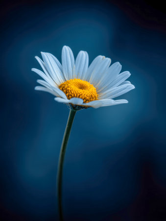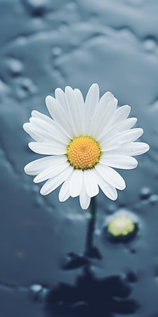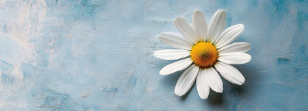 Single daisy flower with white petals and yellow center on a textured blue background, creating a soft and artistic floral design that evokes a sense of natural beauty